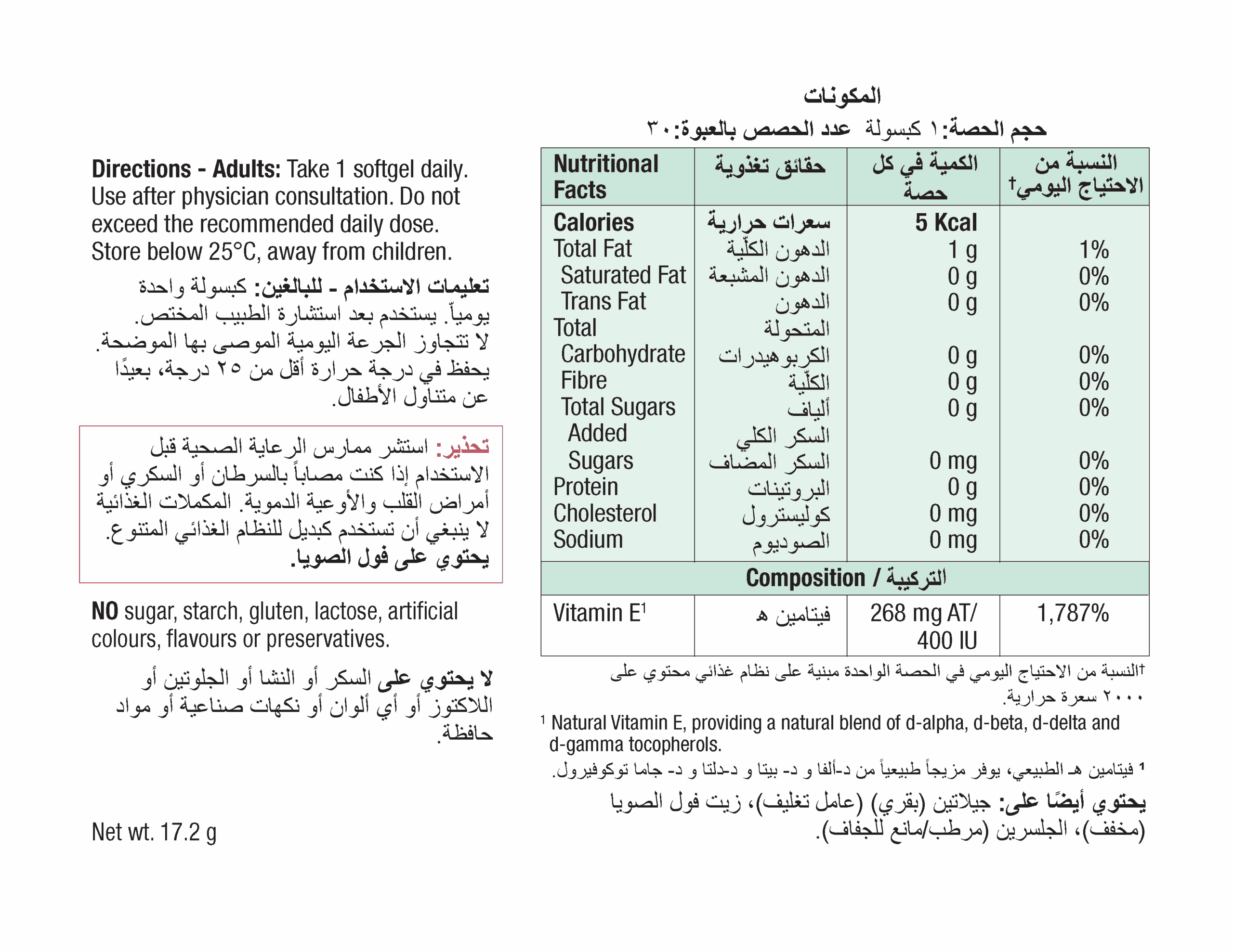 - دعم مضاد للأكسدة: يوفر 400 وحدة دولية من فيتامين E الطبيعي لكل كبسولة جيلاتينية.