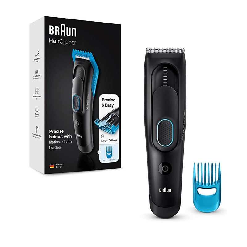 Braun Hair Clipper HC5010 – Ultimate hair clipping experience from Braun, in 9 lengths. One dedicated comb. For 9 precise length settings. The smart trimming attachment allows you to customise your look with any hair style you want. With a total of 9 length settings, you’ll have the flexibility to create a new style for any occasion. The smart trimming comb creates 8 shorter styles (3-24mm long), while an extra short length setting can be used without the comb attachment. The blades of Braun Hair Clipper are engineered for lifetime lasting sharpness, providing the high performance precision you need to achieve your style. The ultra-sharp stainless steel trimming elements ensure that even long or thick hair isn’t a challenge.