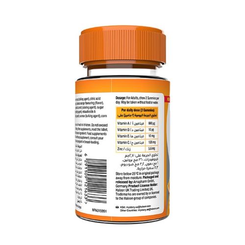 Each gummy contains key nutrients like Vitamin C, Vitamin D, and Zinc, known to help boost immune defenses, plus other vitamins that support energy, bone health, and skin vitality.