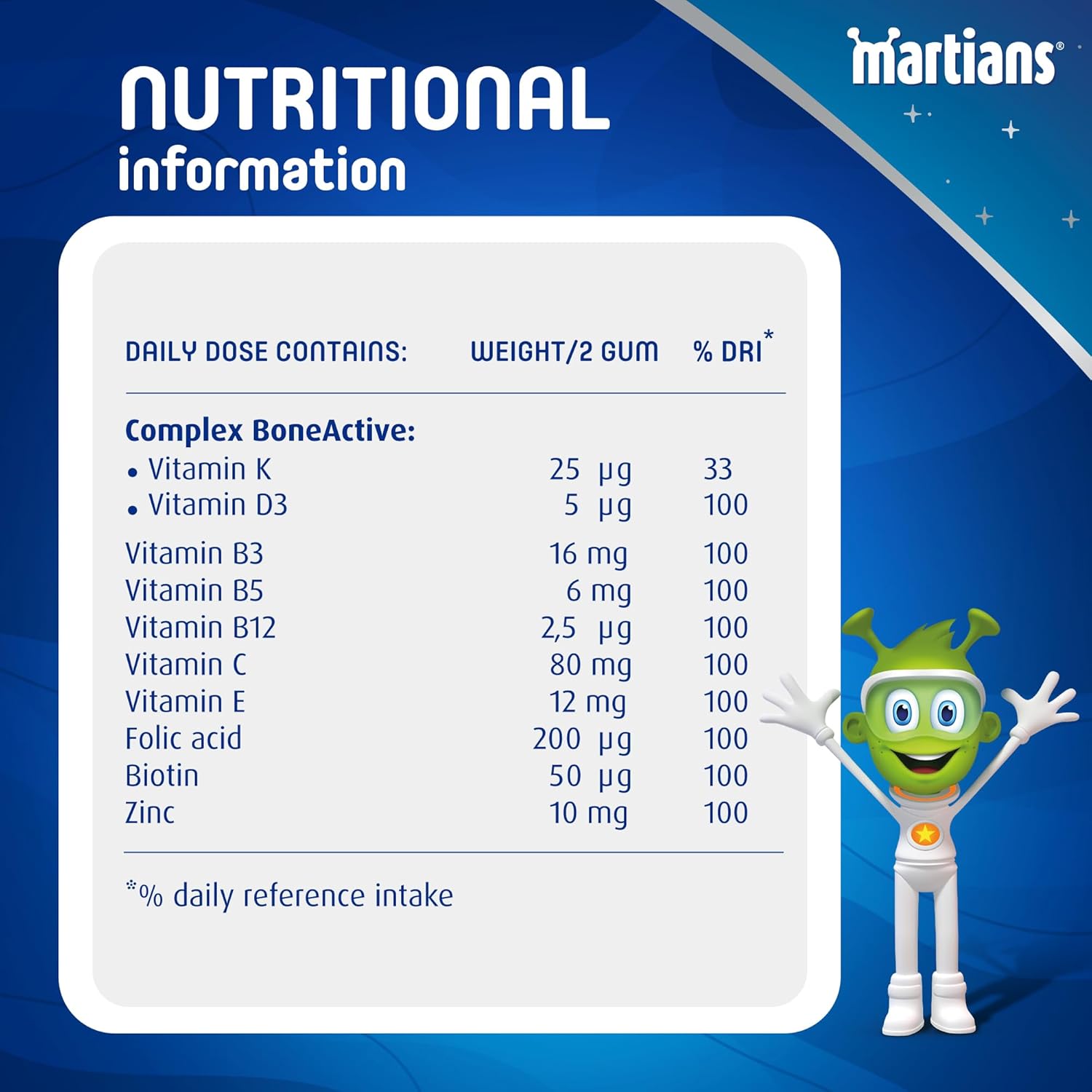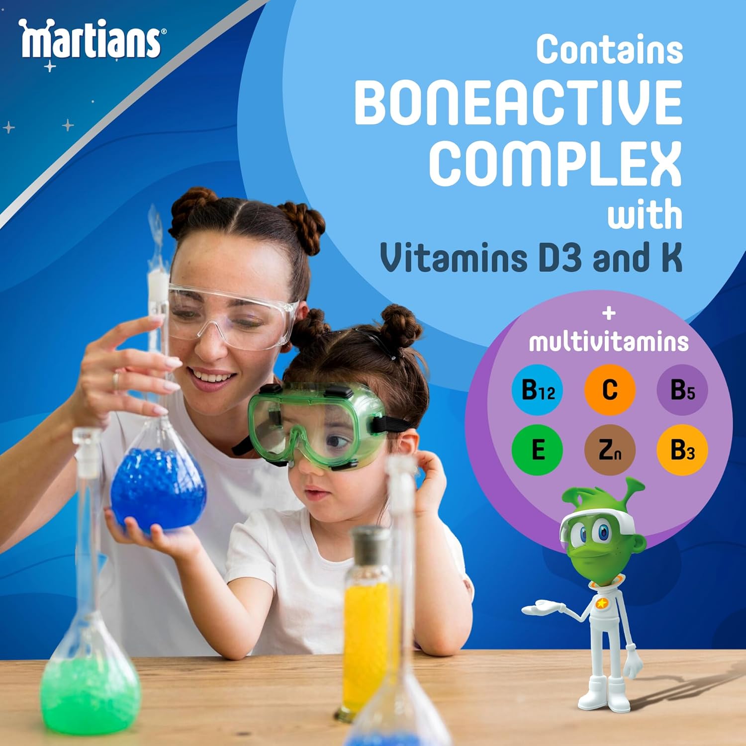 BONEACTIVE COMPLEX: Martians Gummies contain a unique BoneActive complex with Vitamin D3 and K, essential for children’s bone