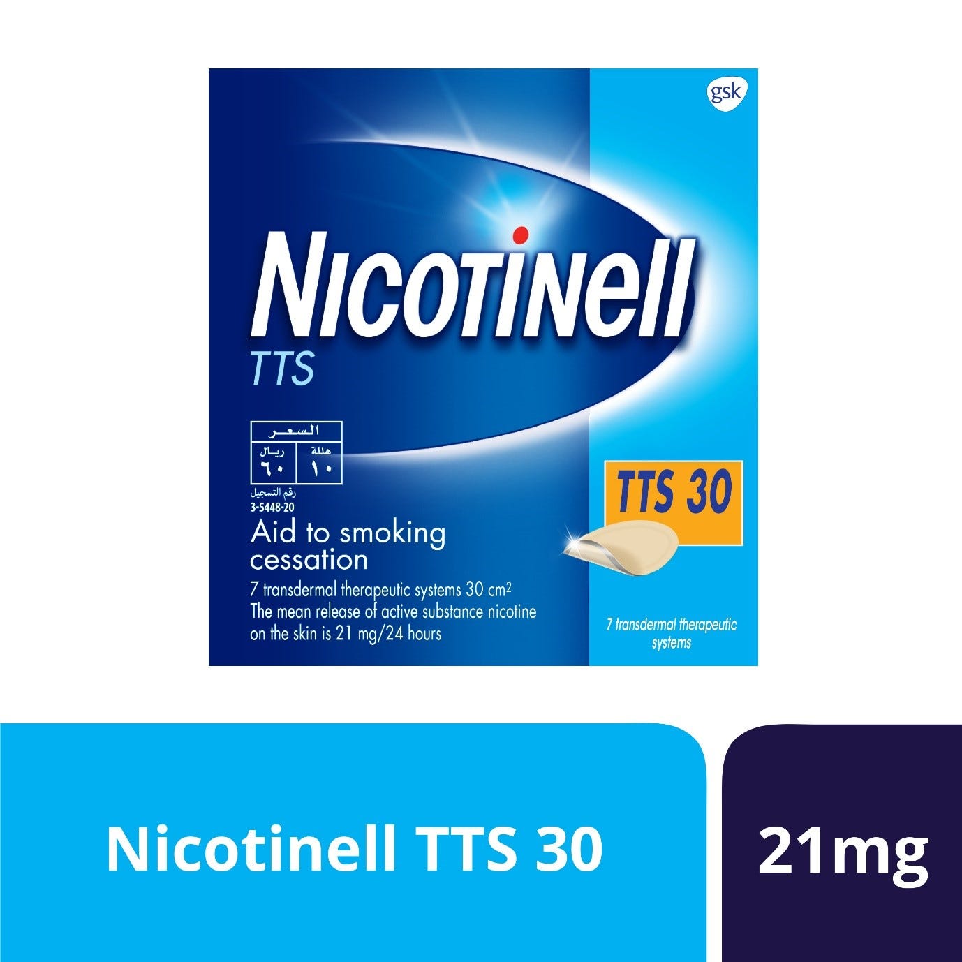 - Nicotinell TTS 30 patches contain 52.5mgof nicotine and deliver on average 21mg of nicotine over 24 hours in a patch size of 30 cm2.The other ingredients are: acrylate esters vinyl acetate, copolymers, fractionated coconut oil, methacrylic acid esters co -polymers, aluminised and siliconised polyester films.