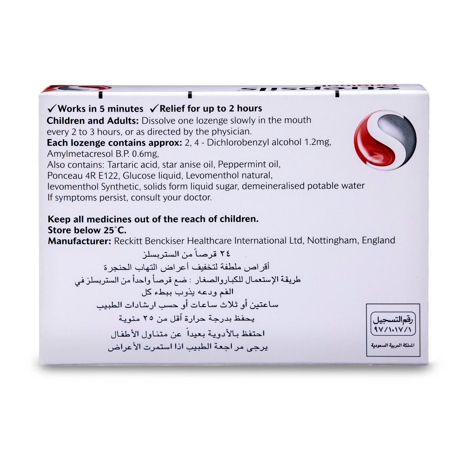 Each Strepsils Regular lozenge contains a combination of two important antiseptics 2, 4- Dichlorobenzyl alcohol and Amylmetacresol which help fight the bacterial throat infections that can cause sore throats.