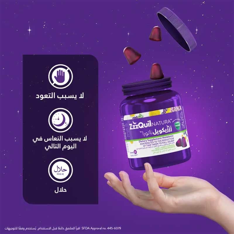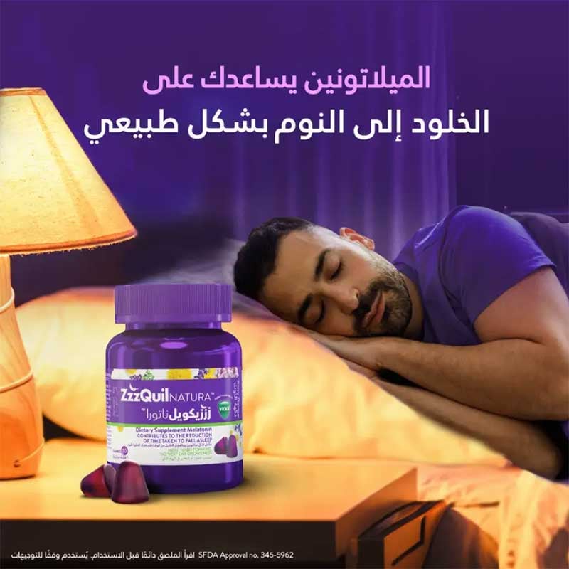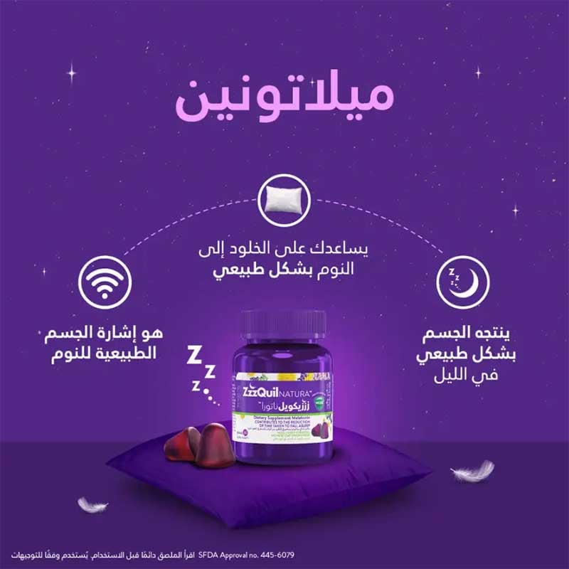 - ZzzQuil NATURA™ dietary supplement melatonin gummy is intended to supplement your body’s natural production of melatonin to help reduce time taken to fall asleep, from World’s No.1 Sleep Aid Brand